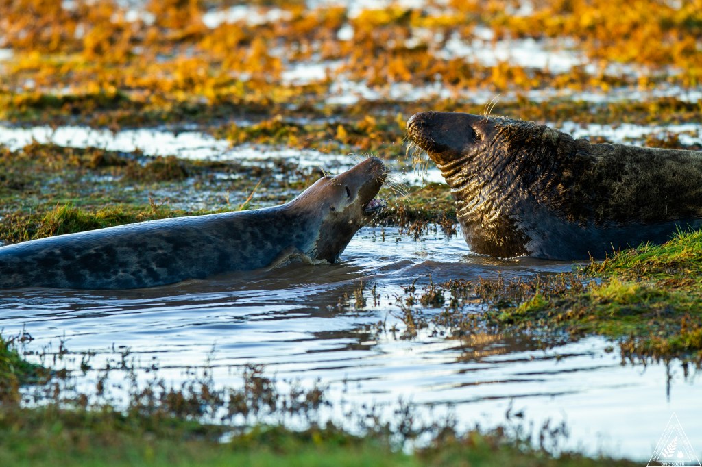 Male Grey Seals (bulls) can measure up to two metres in length and weigh a massive 300 kg. Bulls arrive on our shores before the females and stake out a territory for the winter. The females (cows) arrive soon after, looking for a quiet spot to give birth, and leading to noisy clashes between males who want to claim them for their ‘harem’.