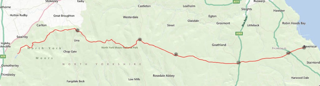 The challenge begins just north of Osmotherley and traverses the full width of the beautiful North Yorkshire Moors, essentially following the line of the watershed at its widest and highest points, ending on the North Sea coast at Ravenscar.